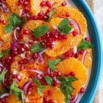 A vibrant and refreshing Mediterranean orange salad featuring sweet Navel oranges, tangy pomegranate seeds, fresh mint, and a honey-lime dressing, perfect as a light side dish or appetizer.
