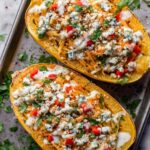- Prepare the squash: Preheat your oven to 400 degrees Fahrenheit. Cut the spaghetti squash in half lengthwise and remove the seeds. Place the halves cut side down on a baking sheet lined with parchment paper.