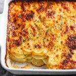 This classic Au Gratin Potatoes recipe features thinly sliced Yukon Gold potatoes baked in a creamy cheese sauce with layers of yellow onion and garlic, topped with a blend of cheddar, gruyere, and Parmesan cheeses. Perfectly tender and rich, this comforting side dish is ideal for holiday dinners or any special occasion.