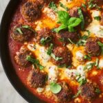 - Assemble and Bake: Using tongs, nestle the fried meatballs into the tomato sauce without crowding. Fill the spaces between the meatballs with torn fresh mozzarella slices. Transfer the skillet or baking dish to the oven and bake for about 15 minutes until meatballs are fully cooked, the sauce is bubbling, and the cheese is melted and gooey.