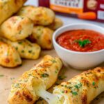 Deliciously golden and buttery Cheesy Stuffed Breadsticks filled with melted Monterey Jack cheese, perfect as a comforting appetizer or snack served with marinara sauce for dipping.