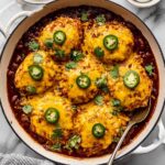 - Add Cornbread on Top: Drop the cornbread batter in 6 to 8 mounds evenly over the chili mixture in the skillet. Optionally top each mound with a sliced jalapeno.