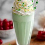 - Serve and garnish: Top each milkshake with whipped cream, sprinkle with green decorator sugar or sprinkles, and place a maraschino cherry on top if using. Serve immediately and enjoy your creamy, minty shamrock treat!