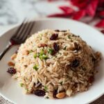 A flavorful rice pilaf with toasted slivered almonds and sweet dried cranberries, cooked with green onions in a buttery broth of chicken stock and water. This dish is perfect as a festive holiday side or a easy accompaniment for weeknight dinners.
