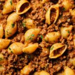 This Easy Creamy Beef and Shells recipe is a comforting, quick, and budget-friendly meal featuring tender pasta shells tossed in a flavorful and creamy ground beef sauce with a hint of chili powder and garlic.