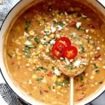 This Buffalo Chicken Chili is a rich, creamy, and hearty dish bursting with layers of flavor. It features shredded chicken thighs, sweet corn, smoky fire-roasted tomatoes, creamy white beans, and tangy buffalo wing sauce all combined in a luxuriously creamy broth with cream cheese. Perfectly spicy and comforting, it's topped with blue cheese, crunchy tortilla chips, and avocado for an irresistible meal.
