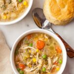 - Serve: Spoon chicken pot pie mixture into bowls or plates and top each serving with a freshly baked biscuit. Enjoy warm.