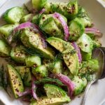A refreshing and easy-to-make Cucumber Avocado Salad featuring sumac-marinated shallots, toasted sesame seeds, and fresh dill. Perfect as a light, vegan, and gluten-free side dish for warm weather meals.