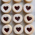 - Assemble the Linzer Cookies: Spread about 1 teaspoon of raspberry jam on the whole cookies. Top each with a cookie with the cut-out center, gently pressing together.