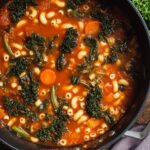 A hearty and comforting Minestrone Soup packed with tender pasta, creamy cannellini beans, kale, carrots, and green beans simmered in a rich tomato and vegetable broth, garnished with fresh basil and shaved parmesan. Perfect for a cozy vegetarian dinner.