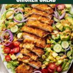 On a big platter or salad bowl, layer chopped romaine, sliced cucumbers, halved cherry tomatoes, crumbled bacon, diced avocado, corn kernels, and thinly sliced red onion. Slice your crispy chicken into strips—keeping them breast-shaped looks nice—and arrange on top.