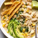 This Instant Pot White Chicken Chili is a creamy, flavorful, and hearty soup made with great northern beans, corn, tender shredded chicken, and a blend of spices. Ready in under an hour, it's ideal for a comforting meal topped with fresh cilantro, avocado, jalapeño, and crunchy tortilla chips.