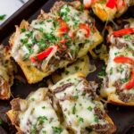 This Philly Cheesesteak Garlic Bread recipe combines the classic flavors of a Philly cheesesteak—shaved steak, sautéed peppers and onions, and melted provolone and mozzarella cheeses—layered on top of a buttery, garlicky French bread loaf, creating a delicious, easy-to-make appetizer or meal perfect for sharing.
