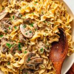 A classic 30-minute Beef Stroganoff recipe featuring tender seared steak, sautéed mushrooms and onions in a garlicky creamy sauce, served over al dente wide egg noodles. Perfect for a quick and comforting dinner.