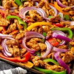 This Sheet Pan Chicken Fajitas recipe features tender chicken breasts and colorful bell peppers and onions, all seasoned with a vibrant blend of spices and cooked together on a single baking sheet for an easy, flavorful, and healthy weeknight dinner.