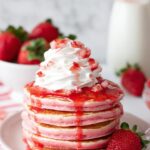 Delight in these fluffy strawberry pancakes made with freeze-dried strawberries for a burst of natural flavor. Perfectly sweetened and lightly colored with optional red food coloring, these pancakes make a fun and irresistible breakfast treat topped with whipped cream, fresh berries, and syrup.