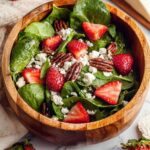 A fresh and vibrant strawberry spinach salad featuring crisp baby spinach, juicy strawberries, crunchy candied pecans, and salty feta cheese, all tossed with a zesty lemon poppy seed dressing. Perfect for a light lunch or a delightful side dish that pleases even picky eaters.