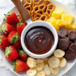 - Serve Fondue: Serve the warm chocolate fondue immediately with your favorite dippers such as fresh fruit, gluten free pretzels, animal crackers, brownies, or cake pieces.